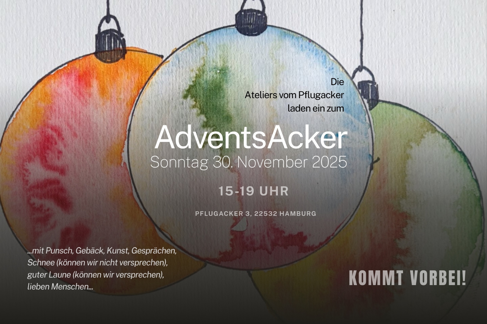 Am Pflugacker wird’s gemütlich: Zum AdventsAcker öffnen mindestens zwei Ateliers ihre Türen. Besucher*innen können entspannt reinschauen, stöbern, Kunst entdecken und ins Gespräch kommen. Vielleicht werden es spontan noch mehr.